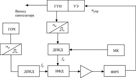 В таком синтезаторе можно получить частоты 935; 935,1; 935,2…959,8; 959,9; 960 МГц – всего 251 дискретную частоту. Перестройку частот производят переключением коэффициента деления NДПКД. Основные характеристики синтезатора с ИФАПЧ получают из уравнения кольца ИФАПЧ. Синтезатор с ИФАПЧ является системой автоматического управления с замкнутым кольцом. Во временной области отклонение частоты ГУНа от номинального значения