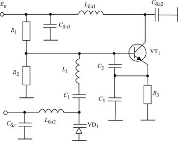 Схема ГУН в виде классического АГ (рис. 2.4) с варикапом VD1, включенным в контур, приведена на рис. 2.28.