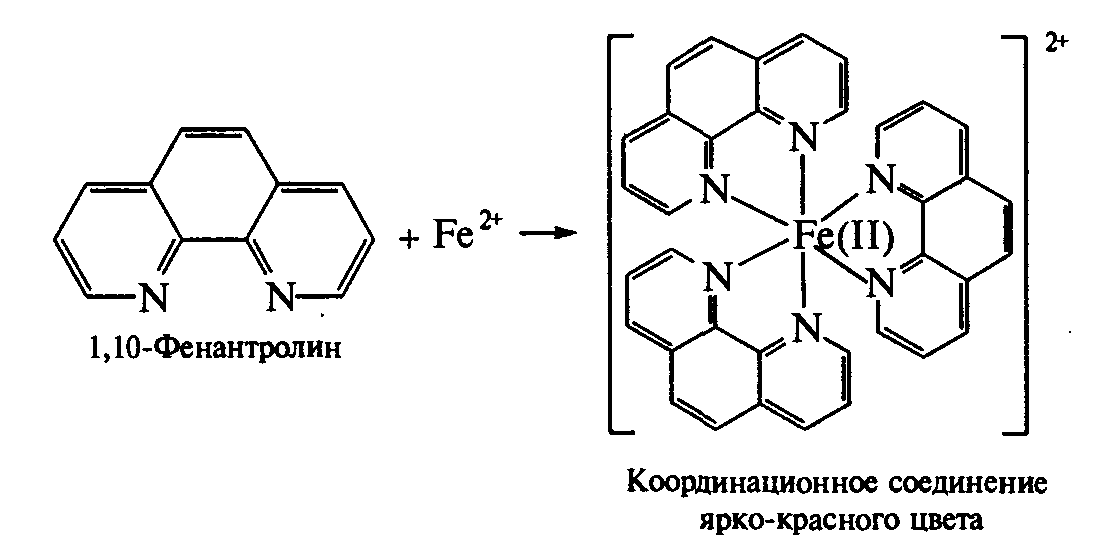 При добавлении к нейтральному или слабо подкисленному раствору субстанции спиртового раствора 1,10-фенантролина (1:50) появляется интенсивное красное окрашивание.