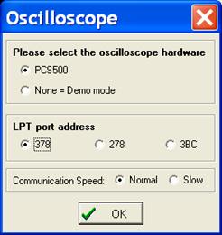 Меню Options. Пункты меню Options позволяют управлять параметрами аппаратной и программной части измерительного комплекса. Состав пунктов меню следующий: - FFT Windows – установка частотных окон при быстром преобразовании Фурье (БПФ); - FFT Options - установка параметров, задающих работу быстрого преобразования Фурье; - Hardware Setup… - установка порта, используемого осциллографом; - Color… - установка цвета объектов экрана; - Trigger Options – установка опции очистки сигнала синхронизации от шума. Пункты FFT Windows и FFT Options будут описаны в разделе, посвященном работе анализатора спектра. Пункт Hardware Setup открывает окно установки параметров осциллографической приставки (рисунок 1.11) (режима работы или режим демонстрации), а также позволяет выбрать адрес параллельного порта, по которому осуществляется подключение осциллографической приставки к персональному компьютеру.