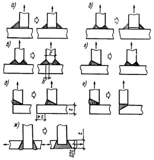 Рис. 21. Тавровые и угловые соединения, в которых возможно возникновение слоистых трещин в основном металле Слева от стрелок а - с односторонними швами без скоса кромок; б, в - с двусторонними швами с двумя скосами одной кромки; г - е - с односторонними швами со скосом одной кромки; ж - с двумя прикрепляемыми через лист-прокладку элементами Справа от стрелок показаны предпочтительные типы соединений в тех случаях, когда это возможно, применять соединения без разделки кромок с минимально возможным объемом наплавленного металла взамен соединений с полным проплавлением (рис. 21, б); применять при статических нагрузках соединения с разделкой кромок (h £ t /3) и неполным проплавлением, которые предпочтительнее соединений с полным проплавлением (рис. 21, в); по возможности избегать применения V-образной разделки, применяя К-образную разделку (рис.21, г); во всех случаях, когда это возможно, применять тавровые соединения вместо угловых (рис. 21, д); для снижения растягивающих напряжений по толщине листа применять нетиповые решения разделки кромок в угловых соединениях (рис. 21, е); в угловом соединении с двумя прикрепляемыми элементами лист-прокладку перекрывать сварным швом до половины толщины прикрепляемых элементов (черт. 21, ж).