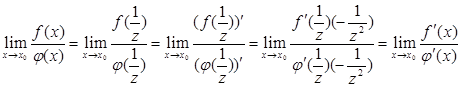 Оскільки Коротко отриману формулу читають так: межа відношення двох нескінченно малих рівна границі відношення їх похідних, якщо останній існує.■ Зауваження: 1. Теорема 7.1.4 вірна і у разі, коли функції і не визначені при, але і. Достатньо, поклавши, отримаємо