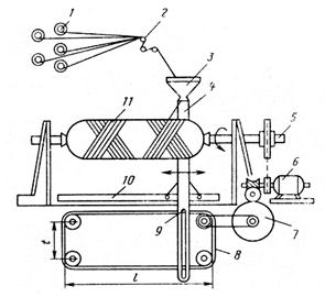 Рис.9.24. Схема процесса формования намоткой волокном. 1 – шпулярник с волокном (ровинг); 2 – натяжное устройство; 3 – ёмкость со смолой; 4 – челнок; 5 – вал; 6 - электродвигатель; 7 – редуктор; 8 - цепь; 9 – сухарь; 10 – рельсовый путь; 11- изделие; l – ход; t – высота.