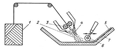 Рис.9.25. Безвоздушная система напыления с двумя ёмкостями. 1 – ровинг (ровинг – это некручёная нить из непрерывных волокон); 2 – смола с катализатором; 3 – рубильное устройство; 4 – смола с ускорителем;5 – уплотнённый слой; 6 – валик; 7- форма.