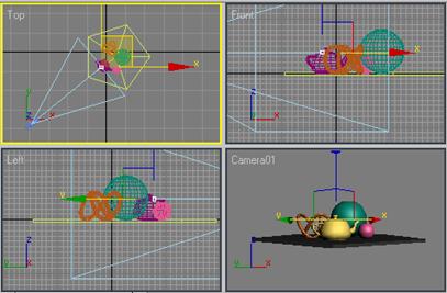 Рис. 1. Исходная сцена в проекции Perspective Рис. 2. Создание нацеленной камеры