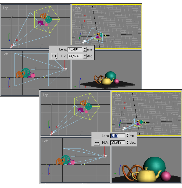 Немного поэкспериментируем с настройками камеры в свитке Parameters панели Modify. Увеличьте значение фокусного расстояния, введя в поле Lens, например, число 85, — это автоматически приведет к уменьшению значения параметра FOV и соответственно к сужению поля зрения (что видно по уменьшению основания пирамиды), в результате чего объекты в окне проекции камеры приблизятся (рис. 8). Откажитесь от изменений, а затем выберите на панели StockLenses стандартный объектив с фокусным расстоянием 85 мм — результат будет тот же самый.