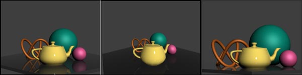 Рис. 9. Визуализация сцены при разном фокусном расстоянии: 50 мм (слева),— 15 мм (в центре), 200 мм (справа)