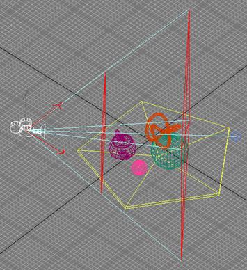Рассмотрим, как влияет на вид сцены добавление плоскостей отсечения. Выделите камеру и в группе ClippingPlanes (Плоскости отсечения) установите флажок ClipManually (Отсечение вручную) — это приведет к появлению дальней плоскости (она представлена прямоугольником с красными диагоналями). Ближняя плоскость отсечения изначально не видна, поскольку по умолчанию она находится на нулевом расстоянии от камеры. Установите для параметров NearClip (Ближняя плоскость отсечения) и FarClip (Дальняя плоскость отсечения) такие значения, чтобы ближняя плоскость отсекла небольшой фрагмент передней части сцены, а дальняя — часть заднего плана (рис. 10). Обратите внимание, что области, находящиеся за дальней или перед ближней плоскостью отсечения, в окне проекции камеры стали невидимыми (рис. 11).