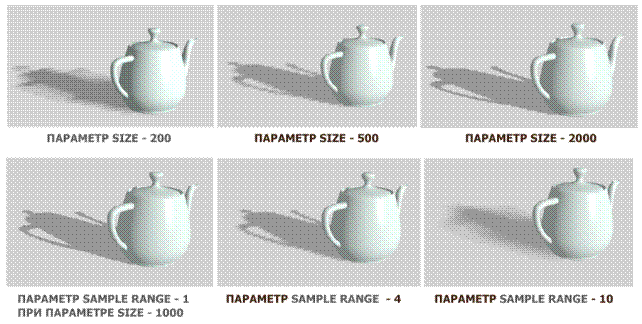 3. Sample Range - размер размытой части тени, размывается кромка тени. Увеличение параметра позволяет избавиться от зубчатого края кромки при низком разрешении карты. 4. Absolute Map Bias - параметр, отвечающий за управление значением Bias. По умолчанию отключено (наилучший результат в большинстве случаев). В случае с анимацией может помочь включение опции 5. 2-Sided Shadows - если выключено, то свет проходит через поверхность, если натыкается на полигоны, обращенные от него нормалями. Включение опции позволяет получить корректные тени На рисунке верхний ряд изображений наглядно показывает изменение качества тени при увеличении параметра Size. Даже значительное увеличение размера карты не решает проблемы зубцов на краях тени, хотя безусловно рисунок тени становится более проработанным. Во втором ряду во всех трех случаях размер карты остается одинаковым, но меняется параметр Sample Range. Постепенно увеличивая его, мы избавились от зубчатости, размыв кромку тени.