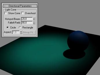 Ситуацию несложно изменить. Вначале разберемся, от каких параметров зависит зона охвата светового потока. Регулируя значения параметров Hotspot / Beam (определяет размер светового конуса для внутреннего, предельно насыщенного луча) и Falloff / Field (устанавливает размер внешних пределов угасания луча к краям) в свитке Directional Parameters, можно изменять размеры появляющегося от светового пучка светового пятна и характер его границы, которая может быть четкой или, наоборот, размытой. По умолчанию пятно отличается четкой границей, что далеко от реальности. Сделайте Hotspot / Beam равным 25, а Falloff / Field — 50, в результате пятно света станет размытым (значения данных параметров в каждом конкретном случае окажутся свои, важно лишь, чтобы значение первого параметра было примерно в два раза больше значения второго). И наоборот, если значения данных параметров близки, то граница будет четкой. Что касается размеров светового пятна, то они напрямую зависят от значения параметра Hotspot / Beam — чем оно выше, тем размер пятна больше. При желании в этом свитке можно также менять форму сечения светового конуса (а значит, и форму светового пятна) с круглой (Circle) на прямоугольную (Rectangle). При выборе последней появляется возможность регулировать соотношения сторон светового прямоугольника параметром Aspect.
