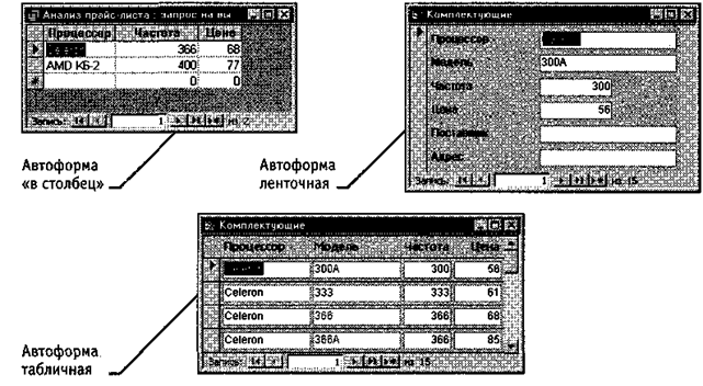 С одной стороны, формы позволяют пользователям вводить данные в таблицы базы данных без непосредственного доступа к самим таблицам. С другой стороны, они позволяют выводить результаты работы запросов не в виде скупых результирующих таблиц, а в виде красиво оформленных форм. В связи с таким разделением существует два вида формирования структуры форм: на основе таблицы и на основе запроса, хотя возможен и комбинированный подход, — это вопрос творчества. Автоформы. В отличие от таблиц и запросов, которые мы формировали вручную, формы удобнее готовить с помощью средств автоматизации. Полностью автоматическими являются средства, называемые автоформами. Существует три вида автоформ: «в столбец», ленточные и табличные (рис. 13.15). Как видно из рисунков, автоформа «в столбец» отображает все поля одной записи — она удобна для ввода и редактирования данных. «Ленточная» автоформа отображает одновременно группу записей — ее удобно использовать для оформления вывода данных. Табличная автоформа по внешнему виду ничем не отличается от таблицы, на которой она основана.