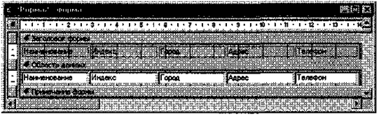 Разделы заголовка и примечания имеют чисто оформительское назначение — их содержимое напрямую не связано с таблицей или запросом, на котором основана форма. Раздел данных имеет содержательное значение — в нем представлены элементы управления, с помощью которых выполняется отображение данных или их ввод. Разработчик формы может разместить здесь дополнительные элементы управления для автоматизации ввода данных (переключатели, флажки, списки и другие, типичные для приложений Windows).