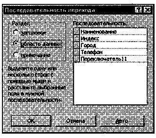 Для управления последовательностью перехода служит диалоговое окно Последовательность перехода. В нем представлен список элементов управления формы. Порядок элементов в списке соответствует текущему порядку перехода. Изменение порядка перехода выполняется перетаскиванием в два приема: • щелчком на кнопке маркера слева от названия выделяется элемент управления (кнопка мыши отпускается); • после повторного щелчка с перетаскиванием элемент перемещается на новое место. Закончив разработку макета формы, ее следует закрыть и сохранить под заданным именем. После открытия формы в окне База данных, с ней можно работать: просматривать или редактировать данные из базовой таблицы. Проверку последовательности перехода выполняют клавишей TAB.