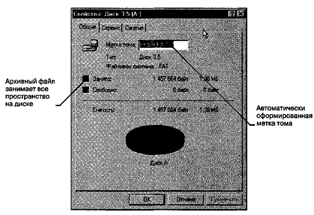 Современные программные средства для создания и обслуживания архивов отличаются большим объемом функциональных возможностей, многие из которых выходят далеко за рамки простого сжатия данных и эффективно дополняют стандартные средства операционной системы. В этом смысле современные средства архивации данных называют диспетчерами архивов. К базовым функциям, которые выполняют большинство современных диспетчеров архивов, относятся: • извлечение файлов из архивов; • создание новых архивов; • добавление файлов в имеющийся архив; • создание самораспаковывающихся архивов; • создание распределенных архивов на носителях малой емкости; • тестирование целостности структуры архивов; • полное или частичное восстановление поврежденных архивов; • защита архивов от просмотра и несанкционированной модификации. Самораспаковывающиеся архивы. В тех случаях когда архивация производится для передачи документа потребителю, следует предусмотреть наличие у него программного средства, необходимого для извлечения исходных данных из уплотненного архива. Если таких средств у потребителя нет или нет оснований предполагать их наличие, создают самораспаковывающиеся архивы. Самораспаковывающийся архив готовится на базе обычного архива путем присоединения к нему небольшого программного модуля. Сам архив получает расширение имени.ЕХЕ, характерное для исполнимых файлов. Потребитель сможет выполнить его запуск как программы, после чего распаковка архива произойдет на его компьютере автоматически. Распределенные архивы. В тех случаях когда предполагается передача большого архива на носителях малой емкости, например на гибких дисках, возможно распределение одного архива в виде малых фрагментов на нескольких носителях. Некоторые диспетчеры (например WinZip) выполняют разбиение сразу на гибкие диски, а некоторые (например WinRAR и WinArj) позволяют выполнить предварительное разбиение архива на фрагменты заданного размера на жестком диске. Впоследствии их можно перенести на внешние носители путем копирования. При создании распределенных архивов диспетчер WinZip обладает неприятной особенностью: каждый том несет файлы с одинаковыми именами. В результате этого нет возможности установить номера томов, хранящихся на каждом из гибких дисков, по названию файла. Поэтому каждый диск следует маркировать пометками на наклейке, а при создании распределенного архива следует аккуратно перекладывать дискеты из начальной стопки в конечную, чтобы не перепутать последовательность немаркированных томов. В случае необходимости узнать номер тома можно не по названию файла, а по метке на диске, хотя эта операция не слишком удобна. Для этого следует открыть окно Мой компьютер, выбрать значок дисковода 3,5 (А:), щелкнуть на нем правой кнопкой мыши и выбрать в контекстном меню пункт Свойства. В диалоговом окне Свойства: Диск 3,5 (А:) на вкладке Общие можно узнать номер тома распределенного архива в поле Метка тома. (рис. 14.2). Диспетчеры архивов WinArj и WinRAR маркируют все файлы распределенного архива разными именами и потому не создают подобных проблем. Гибкие диски являются крайне ненадежными носителями, поэтому архивы, сформированные на жестком диске, должны храниться до получения подтверждения от потребителя о том, что распределенный архив поступил к нему в непо