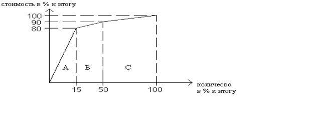 Последовательное применение формулы дает возможность вычислить экспоненциальную среднюю через значения всех уровней данного ряда динамики. Наиболее важной характеристикой в этой модели является L, по величине которой практически и осуществляется прогноз. Чем значение этого параметра ближе к 1, тем больше при прогнозе учитывается влияние последних уровней ряда динамики. Если L близко к О, то веса, по которым взвешиваются уровни ряда динамики убывают медленно, т.е. при прогнозе учитываются все прошлые уровни ряда. В специальной литературе отмечается, что обычно на практике значение L находится в пределах от 0,1 до 0,3. Значение 0,5 почти никогда не превышается. Экспоненциальное сглаживание применимо, прежде всего, при постоянном объеме потребления (L = 0,1 – 0,3). При более высоких значениях (0,3 – 0,5) метод подходит при изменении структуры потребления, например, с учетом сезонных колебаний[14]. Достоверность определяемой потребности на основе рассмотренных выше методов значительно повышается, если они сочетаются с методом экспертных оценок. Сущность его заключается в том, что динамика изменения потребности устанавливается или уточняется на основе опроса специалистов в области снабжения. С этой целью разрабатываются специальные анкеты, в которых формулируются вопросы, касающиеся факторов и общей потребности в материалах. Обобщение и учет мнений специалистов могут оказать существенное влияние на точность прогнозов. Надежность экспертных оценок определяется в первую очередь подбором специалистов-экспертов, их информированностью в изучаемых проблемах, а также возможностями обработки полученной информации. Для обобщения оценок экспертов может применяться метод Дельфы [15]. Особенность метода состоит в последовательном анонимном опросе экспертов, исключающем их непосредственный контакт, направленном на уменьшение группового влияния, возникающего при совместной работе экспертов и состоящего в приспособлении к мнению большинства. Во многом метод расчета потребности в материалах и необходимая точность расчета зависит от различных характеристик материалов. Вспомогательным средством для классификации материалов служит АВС-анализ. Его обычно используют для распределения материалов в зависимости от количества и цены(или каких-либо других характеристик). Его результатом является построение кривой Лоренца. Она характеризует кумулятивное возрастание величин двух взаимосвязанных признаков (в % к итогу), нанесенные на график и показывает степень концентрации отдельных элементов по группам. Для исследуемых обычно соотношений количества и стоимости этот анализ приводит к следующим результатам: небольшое количество наименований деталей и материалов составляет большую часть стоимости, для большого количества наименований эта доля стоимости относительно мала (Рис.8.4).