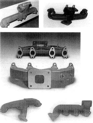 Рис. 10-2. Вершина уехала: разнообразный проект для парных турбин. Отметьте wastegate в множество и никакое условие для взаимной{грубой} трубы{зонда}. Главное{высшее} право: Типичный бросок выпускного коллектора для V-8. Отметьте связь поперечной трубы{поперечного зонда}, входящую в множество от непосредственно мембраны турбинный вход. Центр: простой, изящный проект для VW GTI двигатели. Левая нижняя часть; Единственный{Отдельный} V-8 турбо проект. Более низкий выступ - связь поперечной трубы{поперечного зонда}. от противоположного блока цилиндров. Правая нижняя часть: Охота Большого блока единственный{отдельный} турбо проект с задним входом для взаимной{грубой} трубы{зонда} Пределы лежат со способностью изготовителей образца. Процесс броска - единственный жизнеспособный способ сделать выпускной коллектор с широким разнообразием форм секции и стенных толщин. Опытный или вдумчивый проектировщик может использовать в своих интересах эту особенность{характеристику}, чтобы произвести низкую площадь поверхности, тонкостенную, гладкую{плавную}, множество постоянного прохода секции, Широкое разнообразие железных сплавов существует, но возможно самое полезное для проекта выпускного коллектора - сплав, названный{вызванный} "податливое железо." Особенности{характеристики} податливого железа располагаются от хорошего сопротивления трещины и жаростойкой стабильности формы, чтобы освободить механическую обработку, все с относительно высокой основной{элементарной} силой. Множества броска{состава исполнителей} остаются территорией производителя объема, из-за расхода создания необходимых образцов и обрабатывания инструментом. Мягкая сталь. Хотя мягкая сталь не имеет никаких специфических особенностей{характеристик}, которые делают это идеальным выбором материалов выпускного коллектора, это действительно, действительно, делает почти все хорошо. Этот материал недорог, легок на машину{механизм} и сварку, и с готовностью доступен в широком разнообразии размеров и форм. Возможно его самая бедная особенность{характеристика} - сопротивление коррозии. Этому можно помочь значительно металлизацией хрома. Спросите индустриально-качественную металлизацию, которая является много раз более толстой чем декоративный хром. Возможно лучше чем хром - некоторые из современных керамических покрытий. Алюминий. Из-за бедной жаростойкой силы алюминия и высоко теплопереносящий коэффициент, исключите это как подходящий материал для автомобильного выпускного коллектора. В некоторых плавающих на лодке{севшихся на корабль} заявлениях{применениях}, где выхлоп выходными и разнообразными поверхностными температурами нужно близко управлять, множество алюминия броска{состава исполнителей} с водяными рубашками становится идеальным выбором. Тепловые Особенности{Характеристики} Стенная толщина специфического материала будет сильно влиять на теплообмен, в этом, чем более толстый материал, тем более быстрая высокая температура поедет через это. Это кажется вопреки логике на первый взгляд, но рассматривать, как быстро нагреваются, был бы вытянут из высокой проводимости, бесконечно толстого алюминиевого множества, в противоположность очень тонкой части нержавеющих окруженный хорошим изолятором как воздух. Теплообмен непосредственно пропорционален площа