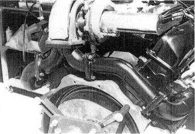 Рис. 10-19. Отметьте "загибание" выпускного коллектора на этом 1986 двигатель YBB, приспособленный с турбо. Это размещение разрешило необычно компактное расположение, поддерживая{обслуживая} гладкий{плавный} проект 4-into-l.