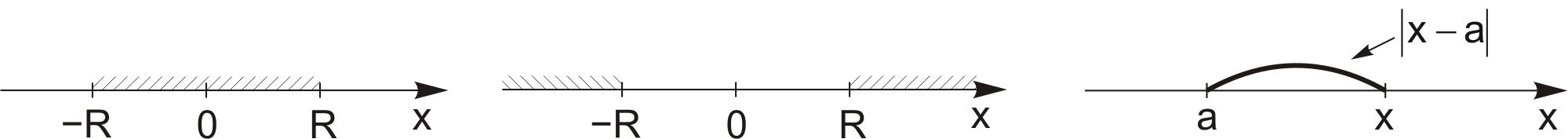 Рис. 5. 5 Рис. 5. 6 Рис. 5. 7 Корисно запам’ятати також, що Наприклад, на числовій прямій множина точок, що задовольняє умову Приклад 5.12. Розв’язати рівняння Розв’язання. Точка Приклад 5.13. Розв’язати рівняння Розв’язання. Для розв’язання цього рівняння краще безпосередньо проаналізувати означення модуля. Модуль числа дорівнює Приклад 5.14. Розв’язати рівняння Розв’язання. Перший спосіб - використання заміни змінної, а саме: позначимо Рівняння можна було розв’язати інакше, а саме розглянути окремо два випадки: Приклад 5.15. Розв’язати нерівність Розв’язання. Нерівність одразу замінимо на Приклад 5. 16. Розв’язати нерівність Розв’язання. Щоб позбавитися знака модуля, розглянемо окремо два випадки: 1) 1) Зауваження. Розглянуті приклади здаються занадто простими, але у подальшому вони можуть змінювати своє “обличчя” та виникати у досить серйозному вигляді, а тоді має неабияке значення вміння розв’язувати їх швидко та правильно (див. завдання 5.10)