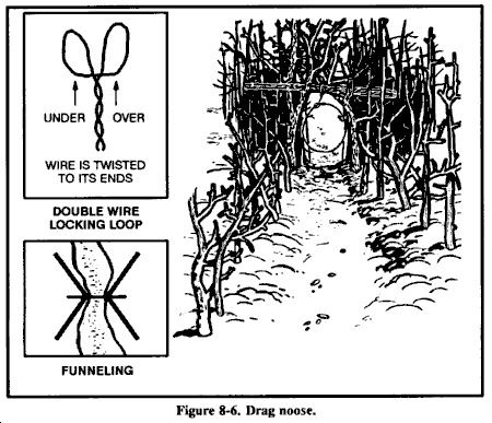 Twitch-Up Drag Noose Use a drag noose on an animal run (Figure 8-6). Place forked sticks on either side of the run and lay a sturdy crossmember across them. Tie the noose to the crossmember and hang it at a height above the animal's head. (Nooses designed to catch by the head should never be low enough for the prey to step into with a foot.) As the noose tightens around the animal's neck, the animal pulls the crossmember from the forked sticks and drags it along. The surrounding vegetation quickly catches the crossmember and the animal becomes entangled.