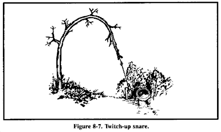 A twitch-up is a supple sapling, which, when bent over and secured with a triggering device, will provide power to a variety of snares. Select a hardwood sapling along the trail. A twitch-up will work much faster and with more force if you remove all the branches and foliage. A simple twitch-up snare uses two forked sticks, each with a long and short leg (Figure 8-7). Bend the twitch-up and mark the trail below it. Drive the long leg of one forked stick firmly into the ground at that point. Ensure the cut on the short leg of this stick is parallel to the ground. Tie the long leg of the remaining forked stick to a piece of cordage secured to the twitch-up. Cut the short leg so that it catches on the short leg of the other forked stick. Extend a noose over the trail. Set the trap by bending the twitch-up and engaging the short legs of the forked sticks. When an animal catches its head in the noose, it pulls the forked sticks apart, allowing the twitch-up to spring up and hang the prey. Note: Do not use green sticks for the trigger. The sap that oozes out could glue them together.