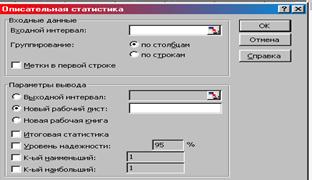Рис. 2. Окно «Описательная статистика» 2. В данном окне выбираем команды: Входной интервал – диапазон ячеек со значениями Средняя стоимость образовательных услуг и Количество респондентов (В3:С9); Группировка – по столбцам; Итоговая статистика – активировать, Уровень надежности – активизировать; Уровень надежности – 95%; Выходной интервал – А12; ОК (рис. 3).