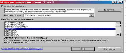 Рис. 6. Окно «Мастер функций шаг 1 из 2» 4. Появляется окно «Аргументы функции». Число 1 – диапазон ячеек таблицы 1, содержащих значение первого признака (В2:В9)