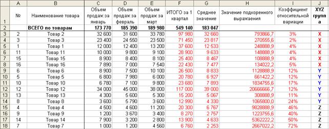 При проведении XYZ анализа данные сортируем не по объему продаж, а по коэффициенту относительной вариации, то есть в начало списка уходят данные, объем продаж по месяцам которым примерно одинаков и следовательно процент разброса этих данных будет минимален. Если объем продаж «плавает» от месяца к месяцу, и соответственно чем больше этот разброс, тем больше будет процент (коэффициент относительной вариации). Группа X – объекты, коэффициент вариации значение по которым не превышает 10%. Группа Y - объекты, коэффициент вариации по которым составляет 10% - 25%. Группа Z – объекты, коэффициент вариации по которым превышает 25%. Таблица 4 Расчетная таблица XYZ - анализа