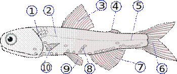 The anatomy of Lampanyctodes hectoris (1) - жаберная крышка, (2) - боковая линия, (3) - спинной плавник, (4) -, (5) - хвостовой стебель, (6) - хвостовой плавник, (7) - анальный плавник, (8) - фотофорез, (9) - анальный плавник (парный), (10) - грудной плавник (парный)