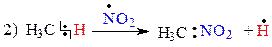 В уравнении 2) связь C-H малополярная, поэтому разрыв такой связи под воздействием радикального реагента · NO2 (R) будет гомолитическим. В результате образуется новая частица · H (R).
