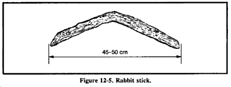 OTHER EXPEDIENT WEAPONS Arrow Points To make an arrow point, use the same procedures for making a stone knife blade. Chert, flint, and shell-type stones are best for arrow points. You can fashion bone like stone--by flaking. You can make an efficient arrow point using broken glass. You can make other field-expedient weapons such as the throwing stick, archery equipment, and the bola. The throwing stick, commonly known as the rabbit stick, is very effective against small game (squirrels, chipmunks, and rabbits). The rabbit stick itself is a blunt stick, naturally curved at about a 45-degree angle. Select a stick with the desired angle from heavy hardwood such as oak. Shave off two opposite sides so that the stick is flat like a boomerang (Figure 12-5). You must practice the throwing technique for accuracy and speed. First, align the target by extending the nonthrowing arm in line with the mid to lower section of the target. Slowly and repeatedly raise the throwing arm up and back until the throwing stick crosses the back at about a 45-degree angle or is in line with the nonthrowing hip. Bring the throwing arm forward until it is just slightly above and parallel to the nonthrowing arm. This will be the throwing stick's release point. Practice slowly and repeatedly to attain accuracy.