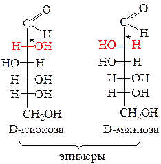 Монозы, отличающиеся друг от друга конфигурацией лишь одного асимметрического атома углерода, называются эпимерами. Например, D-глюкоза и D-манноза.