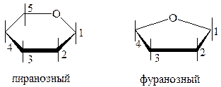 Пиранозный и фуранозный циклы изображаются в горизонтальной плоскости. Связи, расположенные ближе к наблюдателю, отмечают жирной линией. Атом кислорода в пиранозном цикле располагают в правом верхнем углу, в фуранозном – за плоскостью цикла в верхнем углу. Атомы углерода, которые находятся в цикле, не пишут. Нумерацию атомов углерода начинают от кислорода по часовой стрелке.