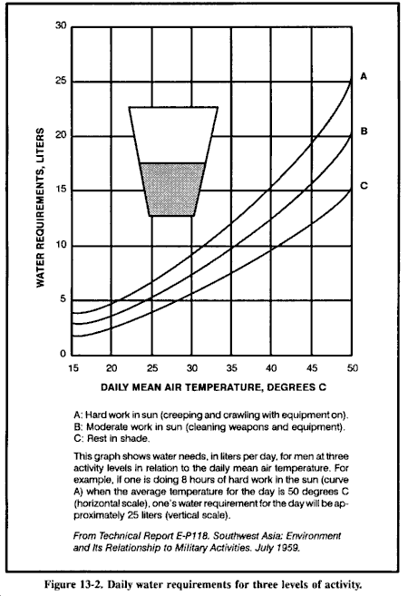Mirages Mirages are optical phenomena caused by the refraction of light through heated air rising from a sandy or stony surface. They occur in the interior of the desert about 10 kilometers from the coast. They make objects that are 1.5 kilometers or more away appear to move. This mirage effect makes it difficult for you to identify an object from a distance. It also blurs distant range contours so much that you feel surrounded by a sheet of water from which elevations stand out as "islands." The mirage effect makes it hard for a person to identify targets, estimate range, and see objects clearly. However, if you can get to high ground (3 meters or more above the desert floor), you can get above the superheated air close to the ground and overcome the mirage effect. Mirages make land navigation difficult because they obscure natural features. You can survey the area at dawn, dusk, or by moonlight when there is little likelihood of mirage. Light levels in desert areas are more intense than in other geographic areas. Moonlit nights are usually crystal clear, winds die down, haze and glare disappear, and visibility is excellent. You can see lights, red flash-lights, and blackout lights at great distances. Sound carries very far. Conversely, during nights with little moonlight, visibility is extremely poor. Traveling is extremely hazardous. You must avoid getting lost, falling into ravines, or stumbling into enemy positions. Movement during such a night is practical only if you have a compass and have spent the day in a shelter, resting, observing and memorizing the terrain, and selecting your route. The subject of man and water in the desert has generated considerable interest and confusion since the early days of World War II when the U. S. Army was preparing to fight in North Africa. At one time the U. S. Army thought it could condition men to do with less water by progressively reducing their water supplies during training. They called it water discipline. It caused hundreds of heat casualties. A key factor in desert survival is understanding the relationship between physical activity, air temperature, and water consumption. The body requires a certain amount of water for a certain level of activity at a certain temperature. For example, a person performing hard work in the sun at 43 degrees C requires 19 liters of water daily. Lack of the required amount of water causes a rapid decline in an individual's ability to make decisions and to perform tasks efficiently. Your body's normal temperature is 36.9 degrees C (98.6 degrees F). Your body gets rid of excess heat (cools off) by sweating. The warmer your body becomes--whether caused by work, exercise, or air temperature--the more you sweat. The more you sweat, the more moisture you lose. Sweating is the principal cause of water loss. If a person stops sweating during periods of high air temperature and heavy work or exercise, he will quickly develop heat stroke. This is an emergency that requires immediate medical attention. Figure 13-2 shows daily water requirements for various levels of work. Understanding how the air temperature and your physical activity affect your water requirements allows you to take measures to get the most from your water supply. These measures are--