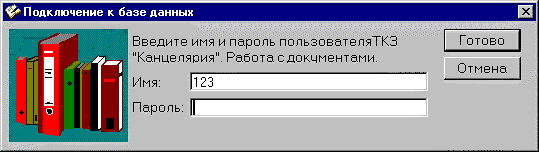 Для работы с ПМ «Работа с текущими документами» предусмотрены два уровня доступа пользователей: · работники канцелярии, которым доступны все режимы работы; · лица, имеющие доступ только к просмотру документов. Чтобы получить доступ к работе с комплексом задач, новый пользователь должен обратиться к администратору базы данных, который зарегистрирует его, установит требуемый уровень доступа и присвоит пароль для работы. ПМ «Работа с текущими документами» разработан как приложение Windows. Запуск задачи выполняется двойным «щелчком» «мыши» по значку задачи После запуска программы откроется окно, в котором пользователь должен ввести свои имя и пароль доступа к базе данных (рис. 2.1.).