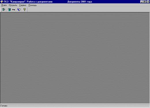 Основными элементами окна являются: · строка заголовка (синяя), содержащая (слева направо) кнопку меню управления окном, наименование окна и кнопки свертывания окна в значок, развертывания во весь экран и завершения работы с задачей; · строка меню; «щелчком» «мыши» по заголовкам меню с последующим выбором пункта меню можно запускать тот или иной режим работы программы. Например, чтобы открыть окно просмотра карточки на документ, нужно «щелкнуть» по заголовку меню «Открыть», затем «щелкнуть» по пункту меню «Просмотр документов»; · панель кнопок (панель инструментов), на которой выведены кнопки быстрого выбора того или иного режима работы. В главном окне - это кнопки: · рабочая область окна, в которой после запуска тех или иных режимов работы будут открыты соответствующие им дополнительные окна; · статусная строка, в которой отображается дополнительная информация о действиях пользователя или состоянии программы. Для удобства работы каждая кнопка на панели инструментов имеет название и краткое описание. Название кнопки появляется при установке на нее указателя «мыши», а краткое описание выводится в статусной строке. Для запуска любого режима достаточно «щелкнуть» левой кнопкой «мыши» по соответствующей кнопке на панели. Для активизации строки меню удобно использовать «горячие» клавиши, которые представляют собой сочетание нажатой клавиши «Alt» и клавиши, соответствующей подчеркнутой букве меню. «Горячие» клавиши могут также использоваться и для выполнения команд, соответствующих некоторым пунктам меню (они указаны напротив названия этих пунктов). В главном окне используются «горячие» клавиши (или их сочетания), назначения которых представлены в табл. 2.1. Таблица 2.1