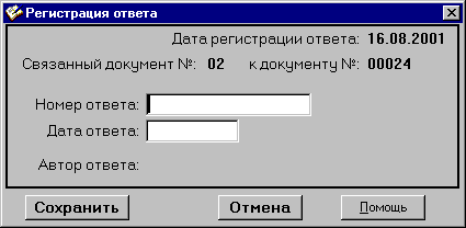 Режим предназначен для регистрации ответов на входящие документы. Запуск режима осуществляется из окна просмотра задачи из меню «Операции/Регистрация ответа». На экране появляется окно рис. 2.48., в котором пользователю следует заполнить соответствующие поля и для сохранения информации нажать клавишу «Сохранить».