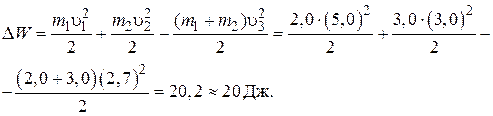 При абсолютно неупругом соударении механическая энергия тел уменьшается на величину Δ W, перешедшую во внутреннюю энергию шаров. Движение происходит на горизонтальной плоскости, поэтому механическая энергия системы обусловлена кинетической энергией шаров. Окончательно для величины Δ W следует