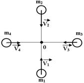 5. Четыре тела, массы которых соответственно равны m 1= m 4 = 1 кг; m 2 = 4 кг и m 3 = 23 кг, двигаются по гладкой горизонтальной поверхности так, что они одновременно достигают точки О. С какой скоростью (в м/с) и в каком направлении будет двигаться система этих тел после абсолютно неупругого удара, если скорости тел до удара соответственно равны V1 = 8 м/с; V2 = V3 = 2 м/с и V4 = 10 м/с?