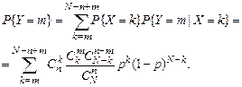 Из корзины извлекается безвозвратная выборка объемом n < N. Пусть Y число черных шаров в выборке. Ряд условного выборочного распределения согласно п.1.1 составит
