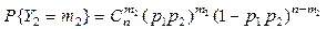 Сумма в последнем выражении представляет собой полную сумму биноминального ряда В (p, N-n), стало быть равна 1. Таким образом доказана следующая теорема: Безвозвратная выборка из конечной биноминальной совокупности сохраняет биноминальный закон распределения с той же вероятностью успеха: 3. Рассмотрим другую ситуацию. Пусть имеется двухзвенная технологическая цепь с вероятностями успешного завершения операций p 1 и p 2 соответственно. Положим, что результаты последовательного прохождения компонентов полуфабриката (заготовок) независимы в совокупности, т.е. реализуется схема Бернулли. Пусть n – число заготовок, поступивших на вход первого звена. Тогда Y 1 – число бездефектных полуфабрикатов на выходе первого звена будет подчиняться биноминальному закону P { Y 1= m 1}~ B (p 1, n). Выход первого звена является входом второго, и условное распределение P { Y 2= m 2 | Y 1= m 1}, m 1 ≥ m 2, также будет биноминальным: B (p 2 , m 1). Безусловное распределение P { Y 2 = m } согласно формуле полной вероятности составит: