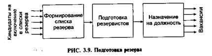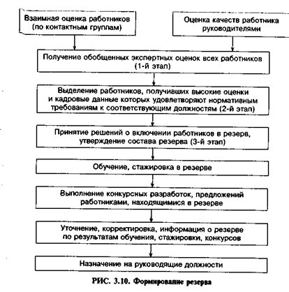 общие положения. Развитие компании, совершенствование работы во всех звеньях управления, эффективность деятельности в производственной, экономической и социальной сферах в условиях рыночных отношений и интернационализации производства и сбыта продукции в значительной мере определяются уровнем работы с персоналом, прежде всего с руководителями и специалистами. · На современном этапе реализации кадровой политики и организации кадровой работы особое значение приобретает опирающаяся на современную научную основу деятельность по формированию резерва кадров, планомерная и кропотливая работа с ним. Работу с резервом кадров, как правило, возглавляет первый руководитель. · Кадровый резерв — это специально сформированная и подготовленная группа работников, предназначенных для выдвижения на руководящие должности более высокого уровня. Эти работники должны: иметь специальную подготовку, необходимую для руководящей должности; обладать требуемыми деловыми и личностными качествами, организаторскими способностями, степень проявления которых устанавливает пригодность специалиста к руководящей работе определенного уровня; достигать требуемых результатов в производственной деятельности. Работа с резервом кадров обеспечивает совершенствование и развитие кадрового потенциала, становление руководителей и специалистов предпринимательского типа, способных адекватно реагировать на изменения во всех сферах деятельности и эффективно работать в современных условиях. Наличие резерва способствует организации планомерного обучения и стажировки, что сокращает период профессиональной адаптации работника, обеспечивает непрерывность процесса управления, существенно уменьшает риск, связанный с ошибками при назначении на освободившуюся должность, позволяет избежать случайностей и своевременно заменять недостаточно подготовленных работников более подготовленными. ОБЩИЕ ПРИНЦИПЫ ПОДБОРА КАНДИДАТОВ В РЕЗЕРВ. Подбор кандидатов в резерв осуществляется на основе строгого соблюдения научно обоснованных методов оценки, подбора, расстановки. При этом учитываются: оценка потенциальных возможностей специалиста занять определенную должность в конкретном коллективе; результаты изучения специалиста, полученные от личного общения с ним и из отзывов непосредственных начальников, коллег и подчиненных; мнение общественных организаций; результаты изучения личного дела; умственные и физические возможности (по данным тестирования); умственные и физические нагрузки (по данным психо- и физиоанализа); ответственность (по должностной инструкции); условия труда (по данным социологического обследования), ПОРЯДОК И МЕТОДИКА ФОРМИРОВАНИЯ РЕЗЕРВА. Формированиерезерва осуществляется в результате выполнения следующих этапов: подготовительная работа; оценка качеств всех работников экспертными группами; выделение в резерв кандидатов, получивших лучшие оценки, результаты деятельности и кадровые данные которых соответствуют требованиям, предъявляемым к соответствующим должностям; принятие решения о включении работников в резерв. Последовательность решения задач формирования резерва, порядок работы и назначения выглядят следующим образом (рис. 3.10.) На 1-м этапе оцениваются деловые, личностные и профессиональные качества работник
