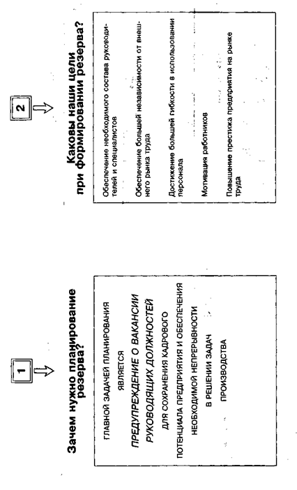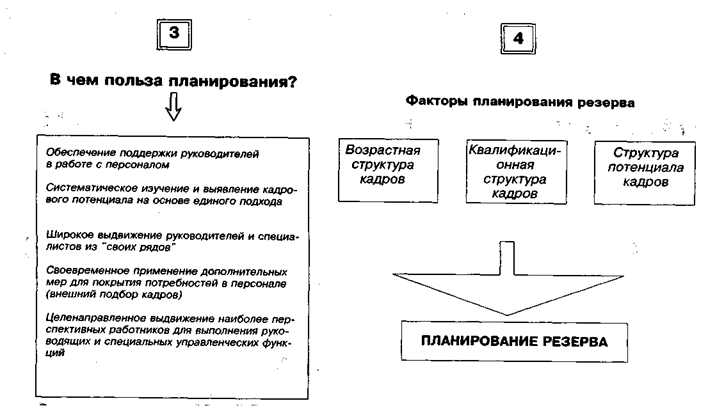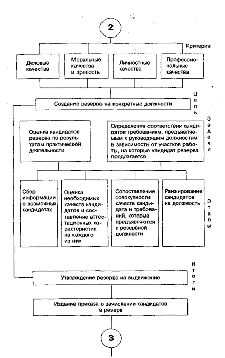 На 2-м этапе формирования резерва из всех аттестуемых выделяются работники, оценки качеств, результаты деятельности и кадровые данные которых удовлетворяют требованиям к соответствующей номенклатуре должностей. Такие требования формируются для каждой номенклатуры должностей с учетом специфики данной организации, предприятия. Набор требований обязательно содержит значения следующих показателей: образование, стаж, опыт руководящей работы; результаты личной деятельности, результаты деятельности руководимого коллектива; обобщенные результаты последней аттестации (экспертизы качеств по данной методике); результаты обучения, повышения квалификации; результаты стажировки; возраст, состояние здоровья и др. Решение о включении специалистов в резерв принимается руководителем предприятия по результатам личного собеседования и собеседования членов аттестационной комиссии с кандидатом. Выводы комиссии утверждает руководитель предприятия, организации в зависимости от номенклатуры резерва. После утверждения списков всем кандидатам объявляется о зачислении их в кадровый резерв на определенные должности. Список резерва может доводиться до сведения всех работников соответствующего предприятия, учреждения. Утвержденный список кадрового резерва — основной источник при назначениях работников на руководящие должности. Состав резерва в конце каждого года пересматривается и пополняется в процессе ежегодного анализа расстановки руководящих кадров и специалистов, а также оценки их деятельности. Оценивается деятельность каждого кандидата, зачисленного в резерв, за прошедший год и принимается решение об оставлении его в составе резерва или исключении из него. По результатам оценки составляется характеристика на каждого специалиста и руководителя, состоящего в резерве, и рассматривается возможность его дальнейшего продвижения по службе. Одновременно рассматриваются новые кандидаты в резерв. Исключение кандидатов из состава резерва может быть произведено по возрасту, состоянию здоровья, неудовлетворительным показателям производственной деятельности, слабой работе по повышению квалификации, недисциплинированности и другим причинам. Кадровый резерв пополняется с соблюдением установленных процедур его формирования. ПЛАНИРОВАНИЕ И ОРГАНИЗАЦИЯ РАБОТЫ С КАДРОВЫМ РЕЗЕРВОМ. Работа с резервом кадров планируется и ведется на короткий (1—2 года) и длительный (5—10 лет) периоды. Главными задачами планирования являются сохранение и развитие кадрового потенциала и обеспечение необходимой непрерывности в решении задач социально-экономического реформирования. Подходы при планировании резерва должны обеспечивать: выявление тенденций развития кадров руководителей и специалистов; определение требований по каждой должности; тщательные и многоэтапные процедуры отбора кадров и соблюдение принципиальных схем замещения должностей и определения источников кадров; карьерное продвижение. Подготовка кадрового резерва состоит в обучении и воспитании работников, зачисленных в резерв, систематическом и всестороннем изучении их в повседневной работе (при этом уточняются профессиональные, деловые и личностные качества кандидатов, их положительные и слабые стороны, степень их готовности для выдвижения на руководящую должн