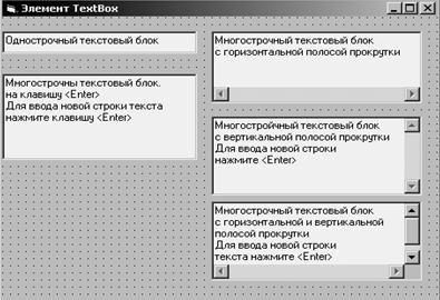Текстовое поле по умолчанию настроено на ввод одной строки текста, что в большинстве случаев вполне достаточно. Если требуется ввести или отобразить на экране большой блок текста, то для этого предусмотрено два специальных свойства MultiLine и ScrollBar.Свойство MultiLine определяет способ отображения текста в текстовом поле. От его значения зависит, будет ли текст находится в одной строке или он будет перенесен по словам на несколько строк. Свойство ScrollBar определяет, будут ли в текстовом поле отображаться полосы прокрутки, и если да, то каков их тип. Оно может принимать одно из четырех значений: 0 – None, 1 – Horizontal, 2 – Vertical и 3 – Both. Значение свойства ScrollBar учитывается только в том случае, если свойство MultiLine равно True. На рис. 4.2.1. показано, как влияют значения этих свойств на внешний вид элементов управления типа TextBox.