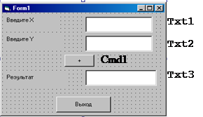Рис. 5.1.2. Форма к примеру №3 Вариант решения 1. Dim x As Double, y As Double, z As Double Private Sub Cmd1_Click() If IsNumeric(Txt1)=True And IsNumeric(Txt2)=True Then x = Txt1.Text y = Txt2.Text z = x + y Txt3.Text = z Else MsgBox "Ошибка ввода данных", vbCritical, "Сообщение" Exit Sub End Sub
