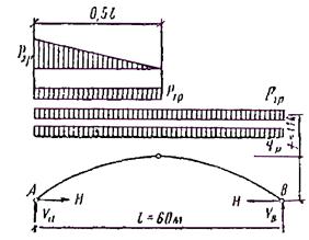 Рис. 43. Схема нагрузок от собственного веса и снега, действующих на арку а) от равномерно распределенной нагрузки по всему пролету: вертикальные опорные реакции VА = VВ = l /2 = 60/2 = 300 кН; горизонтальный распор H = l 2/(8 f) = 602/(8×11) = 410 кН; б) от равномерно распределенной нагрузки на полупролете (слева): вертикальные опорные реакции: VА = 3 l /8 = 3×60/8 = 225 кН; VВ = l /8 = 60/8 = 75 кН; горизонтальный распор H = l 2/(16 f) = 602/(16×11) = 205 кН; в) от распределенной по треугольнику нагрузки наполовине пролета (слева): вертикальные опорные реакции VА = 5 l /24 = 5×60/24 = 125 кН; VВ = l /24 = 60/24 = 25 кН; горизонтальный распор H = l 2/(48 f) = 602/(48×11) = 68,2 кН. Значения Mx, Qx и Nx для загружения (п. а) и на участке 0 ≤ x ≤ l /2 (п. б) вычислены по формулам: Mx = VА × x - x 2/2 - H × y; Qx = - H sin φ + (VА - x)cos φ; Nx = H cos φ + (VА - x)sin φ. На участке l /2 ≤ x ≤ l - по формулам: Mx = VВ (l - x) - Hy; Qx = H sin φ - VВ cos φ; Nx = - H cos φ - VВ sin φ. Для загружения (по п. в) вычисления проводились по формулам на участке 0 ≤ x ≤ l /2: Mx = VА [ x - 3,2(l - x) x 2/ l 2] - Hy; Qx = VА [1 - 4,8(l - x) x 2/ l 2]cos φ - H sin φ; Nx = H cos φ + VА [1 - 4,8(l - x) x 2/ l 2]sin φ; на участке l /2 ≤ x ≤ l: Mx = VВ (l - x) - Hy; Qx = H sin φ - VВ cos φ; Nx = - H cos φ - VВ sin φ. На рис. 44 даны эпюры изгибающих моментов от нагрузок по пп. а, б, в и от сочетания нагрузок по схемам 1, 2 и 3. На рис. 45 даны эпюры нормальных и поперечных сил от сочетания нагрузок по схемам 1, 2 и 3. Вертикальные опорные реакции VА и VВ и распор H для различных схем загружения соответственно равны 384, 384, 523 кН (схема 1); 341, 254, 406 кН (схема 2) и 433, 255, 408 кН (схема 3). Как видно из эпюр, расчетной является схема загружения 3 как по положительным, так и по отрицательным моментам. Максимальный положительный момент имеется в сечениях с абсциссой x = 10 м, а отрицательный - с абсциссой x = 50 м.