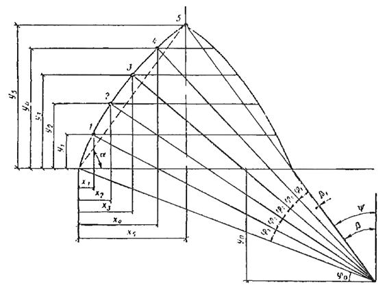 Рис. 49. Построение геометрической оси арки Для определения расчетных усилий каждую полуарку делим на пять равных частей (рис. 49). Длина дуги и центральный угол, соответствующие одному делению, равны. S 1 = S /5 = 20,26/5 = 4,05; φ1 = φ/5 = 31°54 ' /5 = 6°23 '. За начало координат принимаем левую опору, тогда координаты центра кривизны оси полуарки будут равны: x 0 = r cos φ0 = 36,4cos 20°55 ' = 36,4×0,934 = 34 м; y 0 = r sin φ0 = 36,4sin 20°55 ' = 36,4×0,357 = 13 м. Координаты расчетных сечений арки определяем по формулам: xn = x 0 - r cos φ n; yn = r sin φ n - y 0, где φ n = φ0 + n φ1 (n - номер рассматриваемого сечения). Вычисление координат приведено в табл. 28. Для нахождения зоны L = 2 x с, в пределах которой угол наклона к горизонту касательной не превышает 50°, необходимо определить координаты x 50 и y 50 из уравнения кривой полуарки x 2 + y 2 = x 20 + y 20, или после подстановки значении x 0 и y 0: Таблица 28