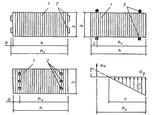 Рис. 62. Варианты анкеровки клееной колонны в подошве посредством металлических деталей 1 - колонна (поперечный разрез); 2 - анкеры 6.51. В зависимости от схемы нагружения колонна рассчитывается на центральное сжатие или на сжатие с изгибом и проверяется на устойчивость плоской формы деформирования. 6.52. Сечение колонны подбирается методом последовательного приближения на воздействие наиболее невыгодного сочетания нагрузок, задаваясь в рекомендуемых пределах значениями высоты и ширины сечения. Подбор сечения анкерных креплений и проверка прочности сечения в пяте колонны (рис. 62) производятся в зависимости от величины эксцентриситета e 0 = M д/ N, где M д = M /ξ. Если e 0 ≤ h /6 и все сечение сжато, то анкерные крепления в пяте ставятся конструктивно. При этом суммарная площадь их сечения должна составлять не менее 1 % площади сечения колонны. Если e 0 > h /6 и сечение колонны сжато не по всей площади, то возникающее растягивающее усилие Na, которое должно быть воспринято анкерными креплениями, определится в первом приближении по формуле Na = N (e 0 - h /2 + x /3)/(h 0 - x /3). (50) x = h [(1 + h)/6 e 0]/2 - высота сжатой зоны сечения, h 0 = h ± a - расстояние от центра тяжести анкерных сечений до сжатой грани колонны в соответствии с рис. 62; a - расстояние от центра тяжести анкерных креплений до ближайшей к ним грани колонны. Площадь сечения анкерных креплений со стороны растянутой зоны сечения колонны определяется из условия Fa ≥ Na / Ra, (51) где Ra - расчетное сопротивление растяжению стальных анкерных креплений (болтов, арматуры). 6.53. Проверка прочности сечения в пяте колонны производится в приведенной ниже последовательности. Сначала находятся возможные предельные значения осевого усилия N 1 и N 2 N 1 = bh 0 R см[2(1 + T / A)] - T; N 2 = bhR см/2, где T - расчетная несущая способность анкерного крепления, принимаемая равной меньшему из двух значений Ta и T д: Ta = FaRa - несущая способность самого анкерного крепления; T д - несущая способность соединения анкерного крепления с древесиной согласно СНиП II-25-80 п. 5.31, при этом должно выполняться условие T д ≥ Na; A = 20 FaR см. Если N ≤ N 1, то прочность сечения обеспечена при Ne ≤ (N + T)(h 0 - x /3), (52) где e = e 0 + ha - h /2; B = 20 Fa (N + T)/(bT). Если N 1 < N <N 2, то прочность сечения обеспеченапри Ne ≤ (1/2) bx (h 0 - x /3) R см, (53) где x = [ N - A + 6.54. Высоту сжатой зоны сечения x можно определить из кубического уравнения, используя выражения (50) и (51) для нахождения Fa: Аx 3 + Вx 2 + Сx + Д = 0, где А = -2 Nb /3, В = -2 Nb (e 0 - h /2); С = -80 NFa [ e 0 + (h ± 2 a)/2]; Д = 80 NFa [ e 0 + (h ± 2 a)/2](h ± a). Тогда напряжения растяжения при анкерном креплении и краевые напряжения смятия в древесине проверяются по формулам: σ a = N (e 0 - h /2 + x /3)/[ Fa (h 0 - x /3)] ≤ Ra; σ aFa ≤ Ta; σд = 2 N (e 0 + h 0 - h /2)/[ bx (h 0 - x /3)] ≤ R см. 6.55. Анкерные крепления конструируются по симметричной схеме и предусматриваются со стороны растянутой и сжатой зоны, имея в виду возможную перемену знака момента в процессе монтажа и при эксплуатации. 6.56. При проектировании соединений деревянных клееных колонн с фундаментами на металлических закладных деталях должны учитываться требования огнестойкости и антикоррозионной защиты.