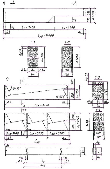 Рис. 69. Заготовочные блоки а) для ригеля; б) для стойки; в) для отдельных слоев Перевозка рам до объекта осуществляется автотранспортом на «приведенное» расстояние - 300 км с учетом структуры автодорог по категориям. Изготовление конструкций предполагается в специализированном цехе, оснащенном комплектным отечественным оборудованием, выпускающим широкую номенклатуру конструкций и входящим в состав крупного деревообрабатывающего комбината. При определении показателей учтена разница в затратах на смежные элементы (связи, элементы из досок для устройства карнизного узла рам ДГР и др.). Подсчет дополнительных затрат для краткости не приводится. Определяем ТЭП вариантов. 1. Расход пиломатериалов V п = k 0 V д = k 1 k 2 k 3 k 4 V 3б = k 1 k 2 k 3 k 4 k 5 k 6 V д, где k 0 - суммарный коэффициент отходов пиломатериалов, равный произведению коэффициентов, учитывающих отходы пиломатериалов при следующих технологических операциях: k 1 - раскрое на черновые заготовки; k 2 - сращивании по длине; k 3 - строжке пластей; k 4 - склеивании по ширине; k 5 - строжке боковых поверхностей заготовочных блоков; k 6 - торцовке и опиловке по шаблону заготовочных блоков (рис. 69). В расчетах на стадии проектирования можно принять: k 1 = 1,13; k 2 = 1,02; k 3 = 1,37 и 1,25 при толщине слоев после строжки соответственно 15 и 33 мм; коэффициент k 4 = 1 + 0,15αш, где αш - доля заготовок, склеенных по ширине, в объеме конструкции в деле принимает значения 0 при ширине до 14 мм, 0,3 при ширине 15 - 20 мм и 1 при ширине св. 20 мм. Коэффициент k 5 = b 0/ b (см. рис. 69). Коэффициент k 6 принимает значения: 1,02 для прямолинейных элементов постоянного сечения, 1,11 для элементов рам РДП, 1,03 для криволинейных арок типа ДСА, 1,07 для гнутоклееных рам ДГР, 1,15 для двускатных балок. V д, V 3б - объем конструкции соответственно в деле и в заготовочном блоке, м3; Vn 1 = 1,13×1,02×1,37×1×1,07×1,07× V д1 = 1,81×1,76 = 3,18 м3; Vn 2 = 1,13×1,02×1,25×1×1,07×1,11 V д2 = 1,71×1,94 = 3,32 м3; соответственно на 1 м2 площади плана V'n 1 = 3,18×29/1512 = 0,061 м3/м2; V'n 2 = 3,32×29/1512 = 0,064 м3/м2. 2. Расход клея Pk = k п[(Р1 + Р2 + Р3) V зб + Р4 V д] = k п{[(g 1(n с - 1)/(δ0 n с) + 1,5 k 3 + 4αш k 3] k 5 k 6 + Р4]} V д, где k п = 1,05 - коэффициент, учитывающий потери клея в производстве; P 1, P 2, P 3 - расход клея при нанесении его на: пласти заготовок, зубчатые шипы при сращивании заготовок по длине и кромки заготовок при склеивании их по ширине, кг/м3; P 4 = 1,2 - расход клея на зубчатый стык в карнизном узле рам РДП, кг/м3; g 1 = 0,4 - суммарный удельный расход клея при нанесении его на пласти заготовок, кг/м2 площади клеевого шва; n с - количество слоев по высоте сечения заготовочного блока; k 3, k 5, k 6 - коэффициенты, учитывающие отходы клея при механической обработке заготовок. Pk 1 = 1,05{[(0,4(36 - 1)/(0,016×36) + 1,5×1,37]1,07×1,07} V д1 = 31,7×1,76 = 55,8 кг; Pk 2 = 1,05{[0,4(38 - 1)/(0,032×38) + 1,5×1,25]1,07×1,11 + 1,2} V д2 = 19×1,94 = 36,8 кг. 3. Расход лакокрасочных составов P э = g э F, где g э - суммарный удельный расход эмали, кг/м2, при окраске за 2 раза, g э = 0,35 кг/м2; F - площадь окрашиваемой поверхности м2; P э1 = 0,35×29 = 10,2 кг; P э2 = 0,35×33 = 11,6 кг. 4. Трудоемкость изготовления T и = k В[(tk + t з + αш t ш + t н.к) L с + (k и t и + k 0 t 0) h 1 L зб + k о.к t о.к F + t тр V зб + t кл P кл + Σ Ti ], где k В = 1,1 - коэффициент, учитывающий трудоемкость вспомогательных операций; t 1 - затраты труда, чел.-ч на первичную единицу измерения объема работ, соответственно на следующие технологические операции: tk - предварительную калибровку пиломатериалов; t з - обработку пиломатериалов на линии раскроя сращивания заготовок по длине с помощью зуб