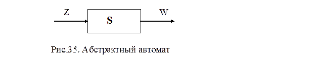 Все рассмотренные выше устройства относятся к классу комбинационных схем, то есть дискретных устройств без памяти. Наряду с ними в цифровой технике широкое распространение получили последовательностные автоматы, или, иначе, комбинационные схемы, объединенные с элементами памяти. Под термином автомат можно понимать некоторое реально существующее устройство, функционирующее на основании как сигналов о состоянии внешней среды, так и внутренних сигналов о состоянии самого автомата. В этом плане ЭВМ может быть рассмотрена как цифровой автомат. Под цифровым автоматом понимается устройство, предназначенное для преобразования цифровой информации. С другой стороны, под термином автомат можно понимать математическую модель некоторого устройства. Общая теория автоматов подразделяется на две части: абстрактную и структурную теорию автоматов. Различие между ними состоит в том, что абстрактная теория абстрагируется от структуры как самого автомата, так и входных и выходных сигналов. В абстрактной теории анализируются переходы автомата под воздействием абстрактных входных слов и формируемые на этих переходах абстрактные выходные слова. В структурной теории рассматривается прежде всего структура как самого автомата, так и его входных и выходных сигналов, способы построения автоматов из элементарных автоматов, способы кодирования входных и выходных сигналов, состояний автомата. В соответствии с этим принято различать две модели автоматов: структурную и абстрактную. Абстрактная модель применяется при теоретическом рассмотрении автоматов. Структурная модель служит для построения схемы автомата из логических элементов и триггеров и предназначена для выполнения функции управления. Абстрактный автомат – это математическая модель цифрового автомата, задаваемая шестикомпонентным вектором S=(A,Z,W,d,l,a1), где А={aa,…,am} – множество внутренних состояний абстрактного автомата; Z=[z1,…,zk} и W={w1,…,wl} – соответственно множества входных и выходных абстрактных слов; d - функция переходов; l - функция выходов; a1 – начальное состояние автомата. Абстрактный автомат может быть представлен как устройство с одним входом и одним выходом (рис. 35), на которые подаются абстрактные входные слова и формируются абстрактные выходные слова.