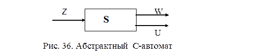 Следовательно, в отличие от автомата Мура для автомата Мили выходной символ w(t) зависит не только от текущего состояния, но и от входного символа. Между моделями автоматов Мили и Мура существует соответствие, позволяющее преобразовать закон функционирования одного из них в другой. Совмещенная модель автомата (С-автомат). Абстрактный С-автомат – математическая модель дискретного устройства, определяемого вектором S=(A,Z,W,U,d,l1,l2,a1), где А, Z, d и а1 определены выше, а W={w1,…,wl} и U={u1,…,ul} – выходной абстрактный алфавит автомата Мили и Мура соответственно, l1 и l2 - функции выходов. Абстрактный С-автомат может быть представлен как устройство с одним входом, на который поступают слова из входного алфавита Z, и двумя выходами (рис. 36), на которых формируются абстрактные выходные слова из выходных алфавитов W и U.
